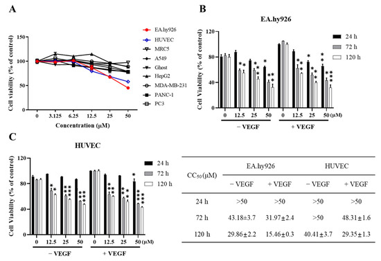 LA decreases the proliferation of EA.hy926 and HUVEC cells in a dose- and time-dependent manner. (A) EA.hy926, HUVEC, MRC5, A549, Ghost, HepG2, MDA-MB-231, PANC-1, and PC3 cells were treated with various concentrations (0–50 μM) of LA for 72 h. Cell viability was determined by MTT assay. Each value is expressed as the mean ± standard deviation (SD) of three independent experiments. (B) EA.hy926 and (C) HUVEC cells were treated with 0–50 µM LA in the presence or absence of 50 ng/mL of the VEGF for different time intervals (24 h, 72 h, and 120 h). CC50 (μM) is expressed as the mean ± standard deviation (SD) of three independent experiments. Statistical significance is indicated as * p < 0.05, ** p < 0.01, and *** p < 0.001. LA-only treated groups were compared to the vehicle control (DMSO), while LA + VEGF-treated groups were compared to the VEGF.