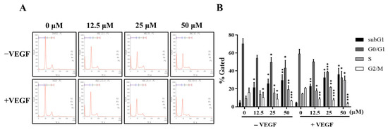 To further explore how LA inhibited endothelial cell proliferation, we analyzed its impact on cell cycle progression in EA.hy926 cells. As shown in Figure 3, LA treatment significantly increased the proportion of cells in the Sub G1 and S-phases in a dose-dependent manner, while reducing the percentage of cells in the G0/G1 and G2/M phases. After 72 h, the S-phase percentage in EA.hy926 cells increased from 9.45% in the control to 13.7%, 15.4% (* p < 0.05), and 19.3% (** p < 0.01) in cells treated with 12.5, 25, and 50 μM of LA, respectively. VEGF co-treatment further increased the percentage of cells in the S-phase to 17.9% (* p < 0.05), 21.1% (** p < 0.01), and 29.8% * (p < 0.05), respectively.
