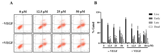 To further confirm the apoptotic effect of LA, flow cytometric analysis using Annexin V/Propidium Iodide staining was performed (Figure 4). As shown by fluorescence-activated cell sorting (FACS) data, LA treatment increased the population of apoptotic cells in a dose-dependent manner. Treatment with 50 μM of LA increased early apoptosis (24.5%) and late apoptosis (21.4%) by more than 8-fold compared to the control cells (2.9% and 2.2%, respectively). In combination with the VEGF, LA further enhanced apoptosis, increasing early and late apoptotic cell populations by 29.2% * (p < 0.05) and 36.5% * (p < 0.05), respectively. These results are consistent with the synergistic effect of LA and the VEGF in increasing the Sub G1 cell fraction, as shown in Figure 3, suggesting that VEGF stimulation increases the sensitivity of endothelial cells to LA, leading to enhanced cell cycle arrest and apoptosis.