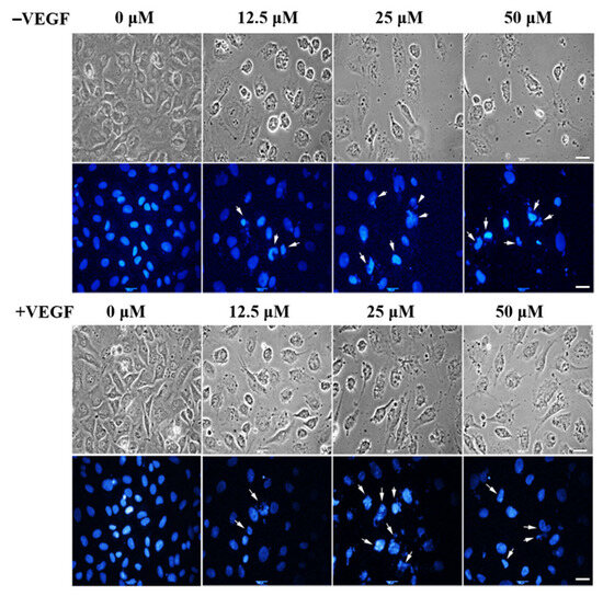 The effect of LA on the nuclei morphology of EA.hy926 cells by Hoechst 33,258 staining. EA.hy926 cells were cultured with 0, 12.5, 25, and 50 μM of LA for 72 h in the presence or absence of 50 ng/mL of the VEGF. The nuclei were visualized under an inverted fluorescent microscope (40×). Arrows indicate apoptotic nuclei. Scale bar, 100 μm.