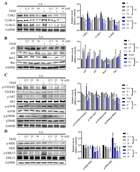 To investigate the molecular mechanisms underlying LA-induced cell cycle arrest and apoptosis, we examined the expression and activation of key proteins involved in cell cycle regulation and apoptosis (Figure 6). LA treatment decreased the expression of cyclins A and E and CDK2, which are essential regulators of S-phase progression (Figure 6A). The combination of LA and the VEGF further reduced the expression of these proteins compared to LA alone. LA also dose-dependently increased the expression of p53, a key regulator of cell cycle arrest and apoptosis, and the proapoptotic proteins p21 and Bax, while decreasing the expression of the anti-apoptotic protein Bcl-2 (Figure 6B). These findings suggest that the antiproliferative effect of LA is mediated by the downregulation of anti-apoptotic signaling involving Bcl-2, as well as by the upregulation of proapoptotic signaling through the Bax and p53 pathways.