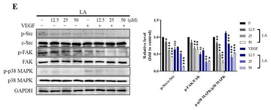 Western blotting was performed according to the standard procedures. Briefly, EA.hy926 cells were cultured at a density of 2 × 105 cells/well in 6-well plates and incubated overnight to allow attachment to the bottom of the plate. Various concentrations of LA in serum-free medium were added to each well and pre-incubated for 3 days in the absence or presence of 50 ng/mL of VEGF-A. After treatment, the cells were washed twice with PBS and lysed in a radioimmunoprecipitation assay (RIPA) buffer at 4 °C. The total protein was extracted, separated using 10% sodium dodecyl sulfate–polyacrylamide gel electrophoresis and 5% stacking gels, and transferred onto a PVDF membrane (Immobilon-P, Millipore, Burlington, MA, USA). The membrane was blocked for 1h at RT using phosphate-buffered saline and tween 20 (PBS-T) containing 5% skim milk and 1% bovine serum albumin (BSA). After washing with PBS-T, the membrane was incubated overnight with the appropriate primary antibodies and alkaline phosphatase-conjugated or horseradish peroxidase (HRP)-conjugated secondary antibodies for 30 min. After incubation, protein bands were detected using the NBT/BCIP solution or a chemilumines cent ECL assay kit (Amersham Pharmacia, Buckinghamshire, UK). Immunoblotted bands were visualized using a LAS-3000 system and quantified using the MultiGauge V 3.0 software (Fujifilm Life Science, Tokyo, Japan).