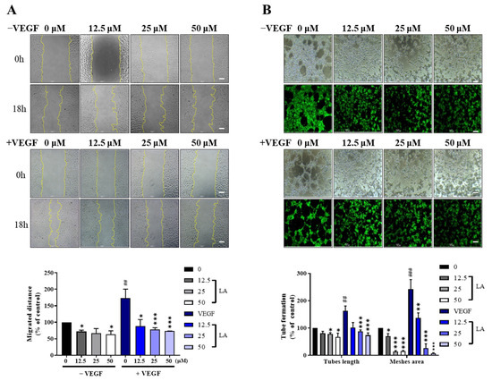 LA inhibits the VEGF-induced migration and tube formation of EA.hy926 cells. (A) Wound-healing scratch assays were performed on EA.hy926 cells plated onto Matrigel-coated dishes. After serum starvation, cells were pre-cultured with or without various concentrations of LA for 48 h and then further incubated with LA for 12 h in the presence or absence of 50 ng/mL of the VEGF. A sterile 200 μL pipette tip was used to create a scratch wound. Cell migration was quantified by measuring the gap size in 4 different images, and representative images are shown. Data are expressed as mean ± SD from three independent experiments. (B) EA.hy926 cells were pre-treated with 0, 12.5, 25, and 50 µM LA for 48 h and then further incubated with LA for 12 h in the presence or absence of 50 ng/mL of the VEGF. Tube formation was quantified by measuring the average of 4 different images, and representative images are shown. Data are expressed as the mean ± SD of three independent experiments. Statistical significance is indicated as * p < 0.05, ** p < 0.01, and *** p < 0.001. LA-only treated groups were compared to the vehicle control (DMSO), while LA + VEGF-treated groups were compared to the VEGF. ## p < 0.01, and ### p < 0.001, compared to the DMSO control. Scale bar, 100 μm.