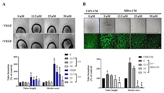 (A) LA inhibits VEGF-induced microvessel sprouting ex vivo. Aortas embedded in Matrigel were treated with LA in the presence or absence of 10 ng/mL of the VEGF. After six days of incubation, microvessel growth from the aortic rings was measured using microscopic images. Data are expressed as the mean ± SD of three independent experiments. * p < 0.05, ** p < 0.01, and *** p < 0.001, compared to the vehicle dimethyl sulfoxide (DMSO) control. (B) LA inhibits the MDA-MB-231 breast tumor cell-stimulated tube formation of EA.hy926 cells. EA.hy926 cells were pre-incubated with LA for 48 h, followed by an additional incubation for 12 h with LA in media containing 50% MDA-MB-231 conditioned media (MDA-CM) or control-conditioned media (CON-CM). Tube formation was quantified by measuring the average of 4 different images, with representative images shown. Data are expressed as the mean ± SD of three independent experiments. Statistical significance is indicated as * p < 0.05, ** p < 0.01, and *** p < 0.001. LA-only treated groups were compared to the vehicle control (DMSO), while LA + VEGF-treated groups were compared to the VEGF. ## p < 0.01, and ### p < 0.001, compared to the DMSO control. Scale bar, 100 μm.