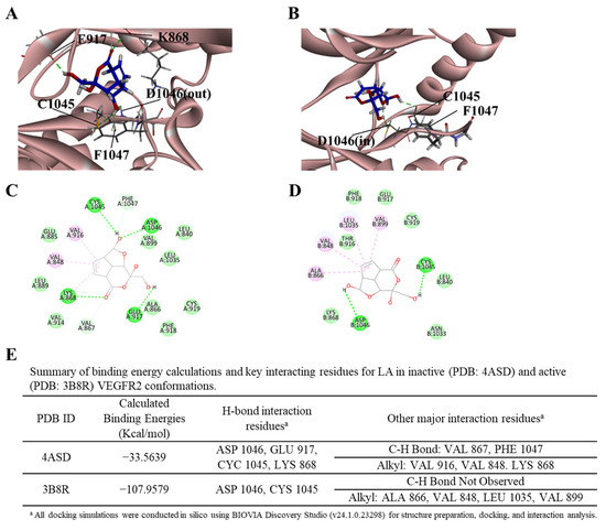 In the inactive VEGFR2 conformation (DFG-out, PDB ID: 4ASD), LA formed stable hydrogen bonds with Asp1046, Cys1045, Lys868, and Glu917, stabilizing its position within the ATP-binding pocket (Figure 9A,C). However, Phe1047 remained in an inward-facing position, obstructing ATP binding and preventing kinase activation. In contrast, in the active VEGFR2 conformation (DFG-in, PDB ID: 3B8R), LA exhibited stronger binding affinity, with Asp1046 and Cys1045 continuing as key interaction sites (Figure 9B,D). Hydrophobic interactions involving Val848, Leu1035, Val899, and Ala866 further contributed to the increased binding affinity in the active state. Additionally, Phe1047 rotated outward, facilitating ATP coordination and kinase activation. The summary table (Figure 9E) highlights the differences in binding affinity and interaction profiles between the two VEGFR2 conformations. These findings suggest that LA preferentially binds the active VEGFR2 conformation, potentially disrupting VEGF-induced signaling. This molecular mechanism explains LA’s enhanced effects under VEGF stimulation.