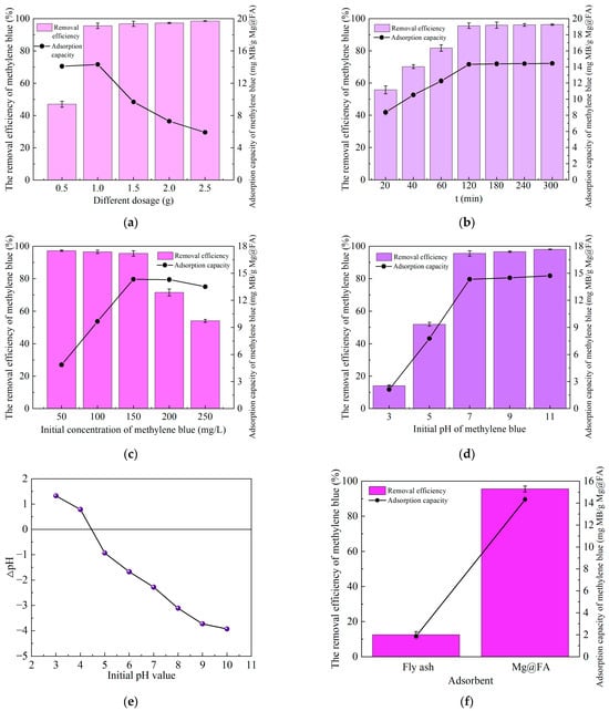 The effect of Mg@FA adsorption of methylene blue. (a) The effect of Mg@FA dosage. (b) The effect of adsorption time. (c) The effect of methylene blue concentration. (d) The effect of solution pH. (e) The point of zero charge (pHpzc) of Mg@FA. (f) A comparison of the adsorption effects of fly ash and Mg@FA on methylene blue.