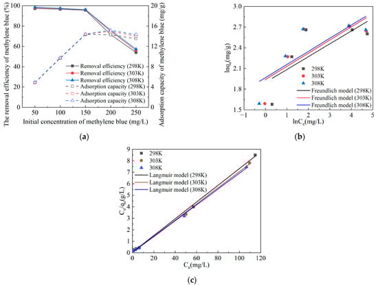 The adsorption of methylene blue by Mg@FA under different temperature conditions is shown in Figure 3a. The adsorption isotherm fitting results of Mg@FA adsorbing methylene blue are shown in Figure 3b,c and Table 3.