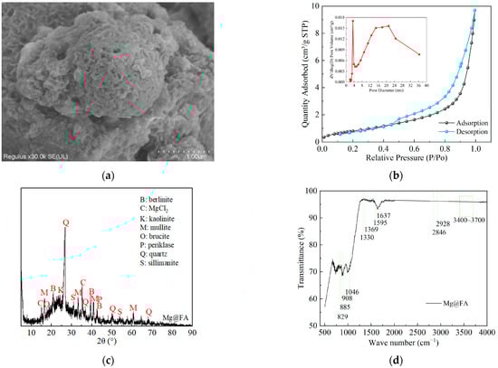 The detection results of Mg@FA are shown in Figure 4a–d. As shown in Figure 4a, the surface of Mg@FA has a large number of raised prismatic structures, which are interconnected to form a network-like structure covering the surface of fly ash. Figure 4b shows the N2 adsorption–desorption isotherm and corresponding pore size distribution of Mg@FA. Based on the data in Figure 4b, the specific surface area of Mg@FA was calculated to be 3.1563 m2/g, and the total pore volume was 0.014745 cm3/g using the Brunauer–Emmett–Teller (BET) method. The average pore diameter of Mg@FA was found to be 14.9825 nm using the Barrett–Joyner–Halenda (BJH) theory for mesopore analysis. This indicates that the surface of Mg@FA has pores, with mesopores being the dominant type. As shown in Figure 4c, the main characteristic diffraction peaks in Mg@FA include mullite, quartz, kaolinite, sillimanite, berlinite, MgCl2, brucite, and periclase. The characteristic diffraction peaks of MgCl2, brucite, and periclase appearing in Mg@FA indicate that Mg was successfully added to the surface of the fly ash. Figure 4d shows that Mg@FA exhibits bending vibration peaks of water molecules at 1637 cm−1 and O-H stretching vibration peaks of free hydroxyl groups in the range of 3400–3700 cm−1 [30]. This suggests that Mg@FA contains a large amount of OH−, which is conducive to promoting the adsorption of methylene blue by Mg@FA.