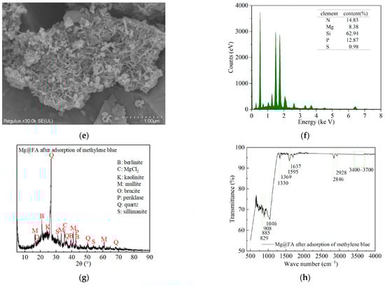 Mg@FA and Mg@FA after the adsorption of methylene blue were analyzed using SEM, EDS, XRD, BET, and FTIR. SEM (Regulus 8100, Hitachi High-Technologies Group, Tokyo, Japan) and EDS (Bruker Nano GmbH, Berlin, Germany) were used to analyze the morphology and elemental content of the materials. XRD (Smart Lab 9, Rigaku Corporation, Tokyo, Japan) was used to analyze the mineral composition of the materials, with a detection range of 5° to 90°. FTIR (Nicolet iS5, Thermo Fisher Scientific, Waltham, MA, USA) was used to analyze the functional groups of the materials, with a testing range from 4000 cm−1 to 500 cm−1. The specific surface area and porosity of the materials were analyzed using an automatic surface area and porosity analyzer (ASAP 2460, Micromeritics Instrument Corporation, Atlanta, GA, USA). The results of SEM, EDS, XRD, BET, and FTIR analyses are shown in Figure 4.