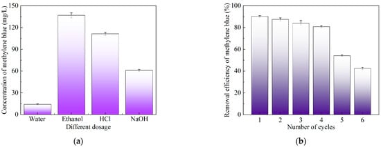 Reusability of Mg@FA. (a) Desorption effectiveness of different eluents. (b) Effect of different adsorption–desorption cycle numbers on adsorption of methylene blue by Mg@FA.
