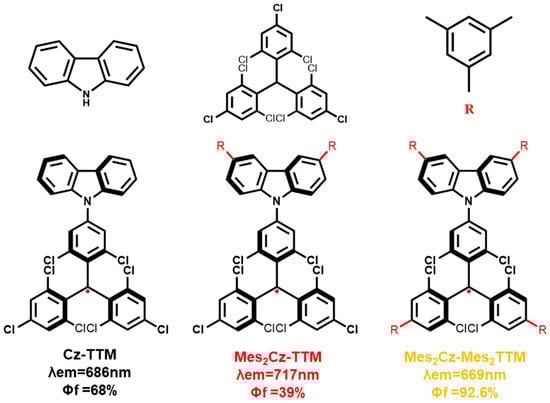Due to the distinctive doublet emission mechanism, organic radicals possess inherent advantages as luminescent materials. With the exception of a few newly developed luminescent radicals, the chlorinated triphenylmethyl (trityl) radicals and their derivatives have been extensively studied [1,2,3,4,5,6,7]. These include tris(2,4,6-trichlorophenyl)methyl (TTM) radicals [8,9,10,11,12,13,14,15,16,17,18,19,20,21], perchloro triphenylmethyl (PTM) radicals [22,23,24], pyridyl-containing triphenylmethyl (PyBTM) radicals [25,26,27,28,29,30,31], (N-carbazolyl) bis(2,4,6-trichlorophenyl)methyl (CzBTM) radicals [32,33,34], and so on. Traditional PTM or TTM derivatives typically feature donor–acceptor structures, with an electron-rich donor (carbazole or triphenylamine, etc.) and an electron-deficient acceptor (PTM or TTM radical core). Some studies had documented significant enhancements in the luminescent properties of these radicals [35,36,37,38,39,40,41,42,43]. However, radicals with high photoluminescence quantum efficiency (PLQE) are still relatively rare compared to other types of organic luminescent materials. Luis Juliá et al. first incorporated carbazole (electron donor) into a TTM radical discovering an efficient red light-emitting radical [17]. However, the terminal modifications of the carbazole donor unit with phenyl derivatives or halogen atoms had a minimal impact on the luminescent efficiency of the radicals in latter works [42,44,45]. In contrast, direct bonding to the radical acceptor core was proved to be more effective [35,36,39,40,41]. However, due to the low luminescence efficiency of the parent radicals (PyBTM, CzBTM), the improvement in PLQE did not meet expectations. Recently, Li et al. reported nearly 100% PLQE radical emitters by fine-tuning the effective donor-acceptor distance in [4-(N-Carbazolyl)-2,6-dichlorophenyl] bis(2,4,6-trichlorophenyl)methyl (Cz-TTM) radical analogues [46]. This suggests that the design strategy of modifying the donor-acceptor radical system to achieve high PLQE is promising. In this study, Cz-TTM with 68% PLQE in toluene was used as the parent radical. Two new Cz-TTM derivatives (Mes2Cz-TTM, Mes2Cz-Mes2TTM) were synthesized by modifying the carbazole donor and TTM radical acceptor unit with 2,4,6-trimethylphenyl (Mes) (Figure 1). In Mes2Cz-TTM, the substitution of Mes on the carbazole donor significantly lowered the luminescence efficiency (39%) compared to the minimal impact with benzene substitution (electron-donating) [44] and the negative impact with the halogen atom (electron-withdrawing) [42,45]. Surprisingly, Mes2Cz-Mes2TTM, with further substitution on the TTM radical acceptor, achieved an excellent PLQE (92.6%). Additionally, both radicals exhibited enhanced photostability and thermostability due to the introduction of donor and acceptor substitutions. This simple molecular design strategy is proved to be highly effective in achieving luminescent radicals with excellent luminescence efficiency.