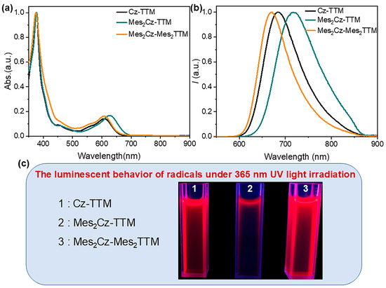(a) The normalized UV-Vis absorption spectra of Cz-TTM, Mes2Cz-TTM, and Mes2Cz-Mes2TTM in toluene solution (1 × 10−5 M) at room temperature; (b) the normalized PL spectra of Cz-TTM, Mes2Cz-TTM, and Mes2Cz-Mes2TTM in toluene solution (1 × 10−5 M) at room temperature; and (c) the luminescent behavior of radicals under 365 nm UV light irradiation in toluene solvent.