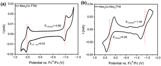 Cyclic voltammetry (CV) curves of Mes2Cz-TTM (a) and Mes2Cz-Mes2TTM (b) in dichloromethane. (The red lines indicate the positions of the half-wave potential.)