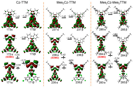 Mes2Cz-TTM and Mes2Cz-Mes2TTM exhibited similar spin-density distributions (Figure S9). The unpaired electron, primarily located on the TTM radical core and partially extending to the carbazole unit, was not obviously affected by the donor and acceptor substitutions. The MOs of Cz-TTM, Mes2Cz-TTM, and Mes2Cz-Mes2TTM showed that the positions of the singly occupied molecular orbital (α-SOMO) and singly unoccupied molecular orbital (β-SUMO) remained largely unchanged. The α-SOMO was mainly located on the TTM radical core and the carbazole unit, while the β-SUMO was distributed over the TTM radical core, with slight extension to the carbazole unit (Figure 6). The energy levels of the α-SOMO and β-SUMO in Mes2Cz-TTM (−5.42 eV, −3.36 eV) were slightly higher than Cz-TTM (−5.45 eV, −3.36 eV) with the substitution on the carbazole unit. Mes2Cz-Mes2TTM exhibited significantly higher α-SOMO (−5.25 eV) and β-SUMO (−3.06 eV) energy levels due to the additional substitution on the TTM radical acceptor. The results were consistent with the electrochemistry. Time-dependent DFT (TD-DFT) calculations (B3LYP/6-31G(d,p)) were also performed to further explore the excited states. The results showed that the doublet excited states (D1) of Cz-TTM, Mes2Cz-TTM, and Mes2Cz-Mes2TTM originated from the 171β→172β, 235β→236β, and 283β→284β transitions, respectively (Table S4). The increasing trend in energy levels (Cz-TTM < Mes2Cz-TTM < Mes2Cz-Mes2TTM) and transition energies of D1 (Mes2Cz-TTM < Cz-TTM < Mes2Cz-Mes2TTM) confirmed the shift trend in the emission bands.