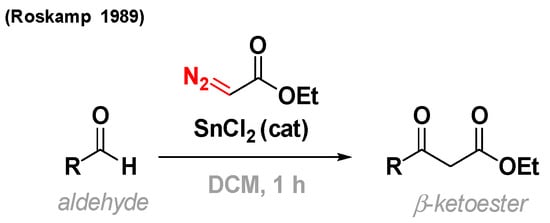 With the aim of generating an alkylidene-type reagent by reacting ethyl diazoacetate with a low-valent main group metal, R. Holmquist and E. J. Roskamp observed that the reaction of aldehydes with diazocarbonyls in the presence of tin-(II) chloride produced a single product: a β-keto ester (Figure 2).