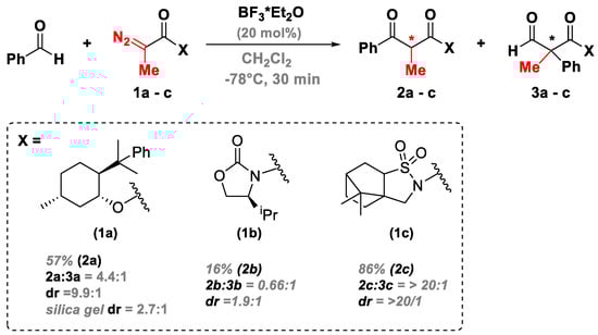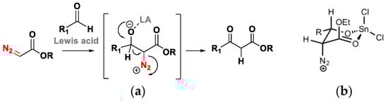 Maruoka, in 2009, reported an innovative procedure that allows for the desirable asymmetric C-C bond formation through the installation of a chiral auxiliary in the α-diazocarbonyl substrate [60]. As in the original Roskamp synthetic pathway, the aldehyde can undergo nucleophilic addition of the α-diazocarbonyl substrates in the presence of Lewis acids (Scheme 2). Indeed, different auxiliaries were screened, thus allowing for the deduction of critical structural characteristics of α-diazocarbonyl that control stereoselectivity.