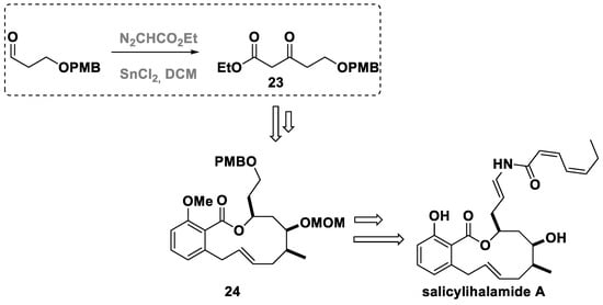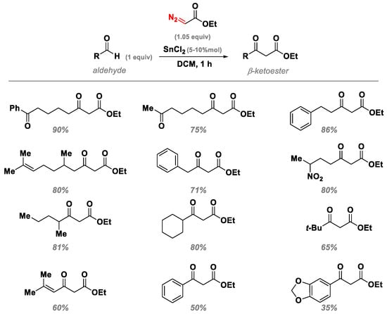 - Holmquist, C.R.; Roskamp, E.J. A selective method for the direct conversion of aldehydes into .beta.-keto esters with ethyl diazoacetate catalyzed by tin(II) chloride. J. Org. Chem. 1989, 54, 3258–3260. [Google Scholar] [CrossRef]
