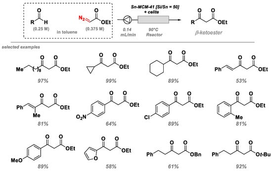 With the increasing attractiveness of continuous-flow technologies adopted in both academia and industry, Ishitani, Kobayashi, and coworkers prepared β-ketoesters utilizing Sn-MCM-41 as a heterogeneous catalyst. The process is characterized by excellent yields, simple and safe operation, and broad functional group tolerance (Figure 5). Notably, some of these manifolds have been subsequently converted into bioactive pyrazoles and coumarins [56].