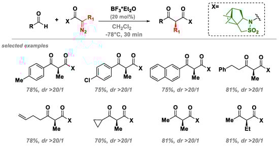 According to the protocol of Maruoka, (−)-camphorsultam-containing diazocarbonyl compounds, in combination with a diverse set of functionalized aldehydes, provided the desired adducts with uniformly high selectivity and stereocontrol (Figure 6). It is important to note that the overall efficiency of the method also relies on the straightforward removal of the auxiliary group.