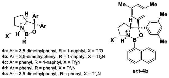To overcome the issues that have emerged with aliphatic aldehydes [45], a new catalytic asymmetric Roskamp reaction was developed by Ryu and coworkers [61]. The procedure involves the use of the oxazaborolidinium ion as a Lewis acid catalyst; this species was generated from the corresponding oxazaborolidine by protonation with triflic imide or triflic acid (Figure 8). In previous studies, this class of catalysts was successfully employed in the enantioselective cyclopropanation of α-substituted acrolein with diazoacetates [62,63].