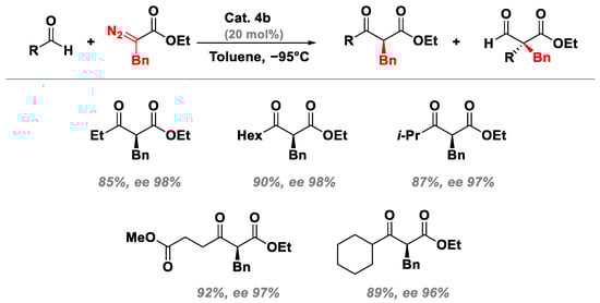 Based on this evidence, Ryu and coworkers showed that by reacting benzyl diazoester with benzaldehydes in the presence of 20 mol % oxazaborolidinium ion (activated by triflic acid—4a), optically active α-alkyl-β-ketoester could be efficiently prepared (compounds 6—Table 1). Although the phenyl migration, yielding compounds 7, could not be fully suppressed, this undesired pathway could generally be well controlled.