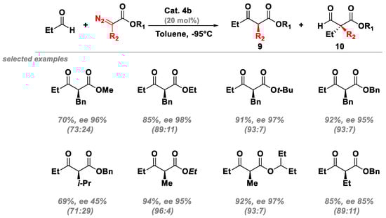 The catalytic system with 4b was also applied to various α-alkyl diazoesters for the implementation of the methodology with propionaldehyde (Figure 11). While more sterically hindered R1 groups resulted in enhanced selectivity, sterically hindered R2 substituents caused a significant decrease in the ratio of 9/10 and enantioselectivity.