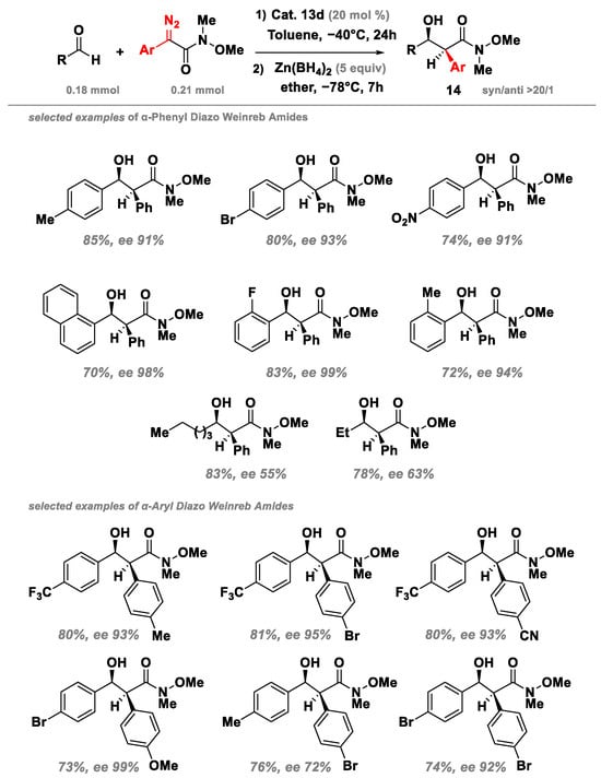 To overcome the difficulties in the isolation of the product at rt, a direct diastereoselective reduction with zinc borohydride at −78 °C was conducted, thus allowing for the preparation of syn-α-phenyl-β-hydroxy Weinreb amide 14 without the loss of optical purity. Accordingly, the desired products were obtained in good yields, high enantioselectivities, and excellent syn stereoselectivities, regardless of the electronic properties of the substituents on the aromatic aldehyde (Figure 13).