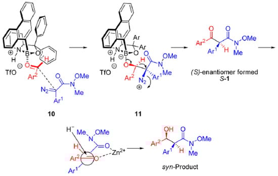 Model for the transition state in the asymmetric Roskamp reaction of α-Aryl diazo Weinreb Amides with aryl aldehydes catalyzed by 13d and the reduction mechanism with zinc borohydride [58].