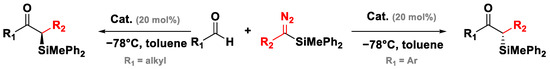 The continuous quest for the development of diazomethane-free homologation methodologies prompted Ryu’s group to design a catalytic asymmetric Roskamp reaction using silyl diazoalkanes [75]. While trimethylsilyldiazometane was extensively used in various transformations [76,77], the use of silyl diazo alkanes was less explored. Thus, Ryu’s group envisioned that the use of these silylated reagents could provide a transition metal-free coupling approach to prepare valuable α-chiral silyl ketones (Figure 15) [78].