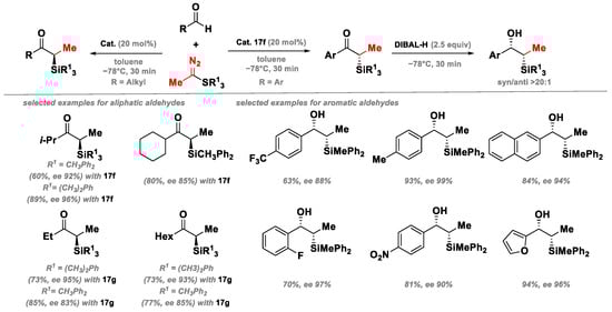 The application of the methodology to aliphatic aldehydes, which are more stable during purification on silica gel, showed that the secondary aldehydes produced improved yields and enantioselectivity when additional phenyl groups were introduced on the silyl diazoethane. The best chiral oxazaborolidiniumion catalyst 17f for aromatic and secondary aldehydes was found to be suboptimal for primary aldehydes; thus, it was replaced with catalyst 17g (Figure 17). In contrast, the reaction of tertiary aldehydes was not feasible.