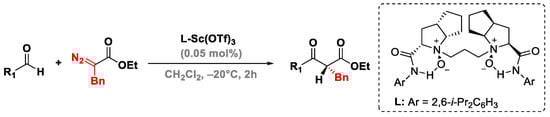 As a result of the steric hindrance of the above-mentioned N,N′-dioxide-scandium(III) complex, the potential migration of the R1 group and the epoxide formation are suppressed, whereas the enantioselectivity and reactivity are remarkably increased (Figure 7). Moreover, the reaction was optimized using 3 Å molecular sieves with a catalyst loading of 0.05 mol %. Aromatic aldehydes bearing substituents with different electronic behaviors, as well as variable steric hindrance, were uniform (up to 98% enantioselectivity and up to 99% yield). However, aliphatic and α, β-unsaturated aldehydes were not optimal substrates for the protocol [45].