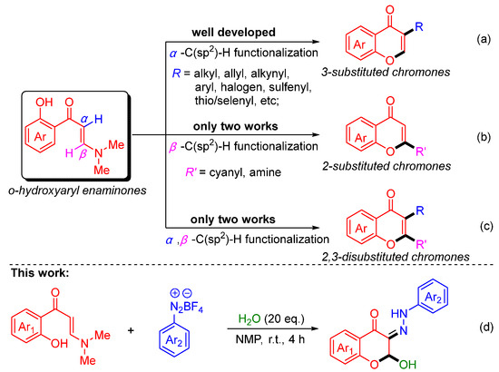 - Song, S.; Peng, M.; Zhang, Z.; Hu, H.; Wei, Y.; Yan, S.-J.; Wang, Y.; Yu, F. Divergent synthesis of 2-chromonyl-3-hydrazono-chromones and 2-alkoxy-3-hydrazono-chromones through switchable annulation reactions of o-hydroxyphenylenaminones with aryldiazonium salts. Org. Lett. 2024, 26, 4980–4985. [Google Scholar] [CrossRef]