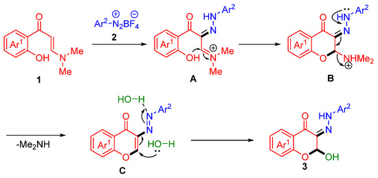 Based on the above experimental results and previous reports [51,52], a plausible mechanism for this cascade α,β-C(sp2)–H bond difunctionalization/chromone annulation reaction was proposed in Scheme 6. First, diazonium salts 2 are coupled with α-position of o-HPEs 1 to form intermediate A, then undergo intramolecular cyclization and deamination to yield intermediate C, which possesses the chromone skeleton. The nitrogen atom of intermediate C forms an intermolecular hydrogen bond with water, activating the N=N double bond. Finally, another molecule of water attacks the 2-position of the chromone skeleton to form the target compound 3.