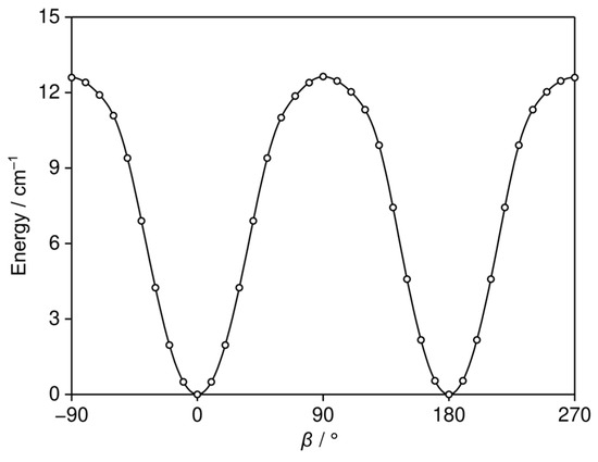 All quantum chemical calculations were performed using the GAUSSIAN 16 software package [30]. To identify the possible conformers of 35DMA, a conformational analysis was conducted by varying the dihedral angle β = ∠(C2, C1, O9, C10) in 10° increments, corresponding to a rotation about the C1–O9 bond (see Figure 1 for atom labeling), while all other geometry parameters were optimized at the B3LYP-D3BJ/6-311++G(d,p) level of theory [31,32,33,34,35], which was used in previous studies on other dimethylanisoles. The potential energy curve is shown in Figure 2. This level of theory predicted two equivalent minima at β = 0° and β = 180°, corresponding to two identical molecular structures of 35DMA.