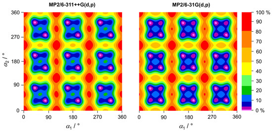 Two-dimensional potential energy surfaces of 35DMA as a function of the dihedral angles α1 and α2, calculated at the MP2/6-311++G(d,p) and MP2/6-31G(d,p) levels of theory. The dihedral angles were varied in 10° increments, while all other geometry parameters were optimized. The numbers in the color code indicate the energy (in percent) relative to the energetic minimum (0%) and maximum (100%), with Emin = −424.244142 Hartree and Emax = −424.243628 Hartree for the MP2/6-311++G(d,p) level, and Emin = −424.083418 Hartree and Emax = −424.082994 Hartree for the MP2/6-31G(d,p) level.