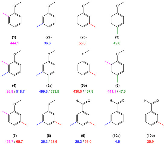 Comparison of the internal rotation barriers of the syn-m and anti-m-methyl groups in 35DMA with the values of other toluene derivatives. (1) o-methylanisole [54], (2a) anti-m-methylanisole [53], (2b) syn-m-methylanisole [53], (3) p-methylanisole [26], (4) 2,3-dimethylanisole [13], (5a) anti-3,4-dimethylanisole [41], (5b) syn-3,4-dimethylanisole [41], (6) 2,4-dimethylanisole [27], (7) 2,5-dimethylanisole [11], (8) 3,5-dimethylanisole (this work), (9) 3,5-dimethylbenzaldehyde [9], (10a) anti-m-methylbenzaldehyde [55], and (10b) syn-m-methylbenzaldehyde [55].