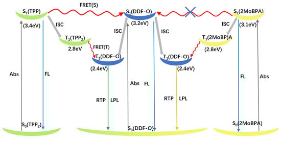 The energy levels of the singlet and triplet states of DDF-O, TPP2, and 2MoBPA are summarized in Table S1. The singlet energy level of DDF-O (3.2 eV) was higher than that of 2MoBPA (3.1 eV) and lower than that of TPP2 (3.4 eV). Therefore, the Förster energy transfer process could occur between the singlet energy level of DDF-O and that of TPP2 in the doped system. After the excitation of the host material TPP2, the generated singlet exciton energy could be transferred to the guest material DDF-O and then decayed by the fluorescence emission pathway, enhancing DDF-O’s fluorescence effect. The fluorescence decay curves further supported this conclusion. The fluorescence emission decay of TPP2: DDF-O at 420 nm fitted a single exponential curve with a lifetime of 1.05 ns, indicating that energy transfer between the host and guest nearly caused the TPP2 fluorescence to disappear and enhanced the fluorescence emission of DDF-O. In contrast, since the singlet energy level of DDF-O was higher than that of 2MoBPA and no Förster energy transfer could occur between the singlet states of DDF-O and 2MoBPA, the fluorescence decay of 2MoBPA: DDF-O fitted a bi-exponential curve, with lifetimes of 1.97 ns and 0.79 ns corresponding to the fluorescence emission decay of 2MoBPA and DDF-O, respectively. As shown in the figure, the phosphorescence peak at 446 nm for TPP:DDF-O was significantly weaker than that of pure TPP, while the phosphorescence peak at 560 nm was markedly enhanced, indicating an energy transfer process between the triplet energy levels of the host and guest. The energy was transferred from the triplet energy level T1 (2.8 eV) of TPP to T1 (2.4 eV) of DDF-O, where the triplet exciton from the T1 energy level of DDF-O then relaxed to the ground state. The long-afterglow generation mechanism of 2MoBPA: DDF-O was similar to that of TPP:DDF-O. The phosphorescence peak at 450 nm of 2MoBPA: DDF-O was significantly weaker than that of pure 2MoBPA, while the phosphorescence peak at 520 nm was dramatically enhanced, and the triplet energy transferred from the 2MoBPA triplet energy level to DDF-O.
