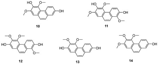Tamus communis, a member of the Dioscoreaceae family, is native to Asia, Africa and Europe. Five phenanthrenes (10–14) (Figure 4) were isolated from the fresh rhizomes of Tamus communis by Réthy. They are 7-hydroxy-2,3,4-trimethoxy-phenanthrene (10), 2,7-dihydroxy-3,4-dimethoxy-phenanthrene (11), 7-dihydroxy-3,4,8-trimethoxyphenan threne (12), 3,7-dihydroxy-2,4,8-trimethoxyphenanthrene (13) and 3,7-dihydroxy-2,4-dimethoxy phenanthrene (14). Compound 10 is a newly discovered natural product, and compounds 11–14 were isolated from Tamus communis for the first time. An in vitro MTT assay assessing the cytotoxicity against the HeLa cell line revealed that compound 12 has significant activity, with an IC50 value of 0.97 μM [20].