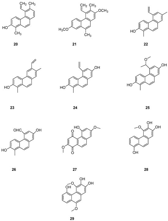 Phenanthrenes are prevalent secondary metabolites in plants of the Lamiaceae family. In 2002, Italian scholar Della Greca et al. isolated two new phenanthrenes (20–21) (Figure 6) and one pyrene compound from Juncus acutus L. [24]. In 2020, Ma’s team isolated nine compounds, including coumarins and eight phenanthrenes, from non-polar n-hexane and CH2Cl2 fractions of Luzula sylvatica. Among them, four compounds were newly discovered: hydrojuncinol (22) (Figure 6), sylvatin A, sylvatin B and sylvatin C. Phenanthrene has demonstrated promising in vitro anti proliferative activity against various cancer cell lines [25,26,27]. Consequently, the cytotoxicity of these compounds was evaluated for THP-1 (a monocytic leukemia cell line) using a diazazoline assay. The IC50 values for compound 22 and hydrojuncuenin (23) (Figure 6) were found to be 3 and 5 μM. Moreover, compound 22 significantly inhibited the production of reactive oxygen species (ROS) in a dose-dependent manner, showing moderate cytotoxicity on THP-1 cells with an IC50 lower than 6 µM [28]. Further research will focus on the most active compounds, particularly the newly identified phenanthrene dehydrogenated nepenthol, aiming to explore its inhibitory effects on other tumor cells and delve deeper into its mechanism of action. Wen ming Liu et al. isolated and purified 2,7-dihydroxy-1-methyl-5-vinylphenanthrene, named dehydrogenated rush alcohol (24) (Figure 6), from traditional Chinese herbal medicine rush, finding that this compound effectively inhibited gastric cancer cell-mediated angiogenesis mimicry with very low toxicity. The activity of SGC-7901 and AGS cells was studied using this compound, and their IC50 values were 35.89 µM and 32.92 µM. DHE has demonstrated an inhibitory effect on the growth of gastric cancer cells [29] by inducing tumor-suppressing endoplasmic reticulum (ER) stress responses and reducing tumor-adaptive ER responses [30]. Two compounds, 5-(1-methoxyethyl)-1-methyl-phenanthrene-2,7-diol (25) and Dehydroeffusal (26) (Figure 6), were isolated from the ethanol extract of Juncus effuses by Ma. Cell activity experiments were conducted on SHSY-5Y, SMMC-7721, HepG-2, Hela and MCF-7 cancer cells. These compounds exhibited selective inhibitory activity against MCF-7 cells, with an IC50 of 10.9 μM. Compound 26 inhibited the growth of HepG2 and HeLa cells, with very similar IC50 values of 12.4 and 13.1 μM, respectively [25]. Denbinobin (27), fimbriol B (28) and 2,3,5-trihydroxy-4,9-dimethoxy phenanthrene (29) (Figure 6) showed a strong ability to induce apoptosis in hepatocytes [31]. Nam et al. studied the cytotoxic effects of nine phenanthrenes and 9,10-dihydro-phenanthrenes on human hypopharyngeal squamous cell carcinoma cell lines, concluding that methylation of the phenolic group or its oxidation to an oxygen-containing group enhances cytotoxic activity [32].