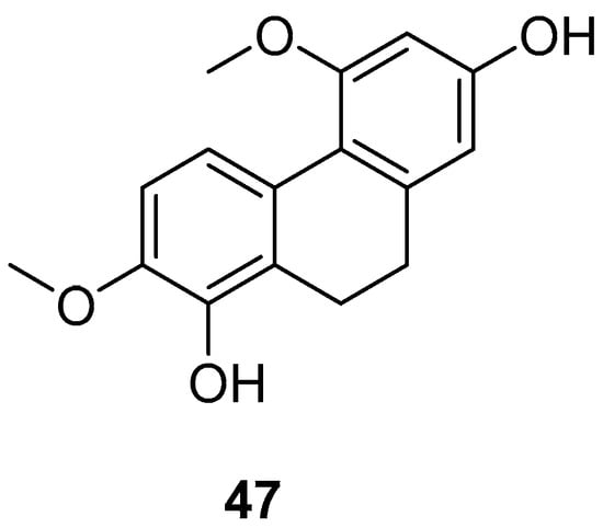 Bai Ji (Bletilla striata), a traditional Chinese medicine, comprises the dried tubers of the orchid plant Bletilla striata (Thunb.) Reichb. f., a prized medicinal variety mainly found in East China, Central South, Southwest, Gansu, Shaanxi and other regions. Guizhou is noted for the largest production and best quality. Annually from September to October, as the stems and leaves wither, the tubers are harvested, roots removed, washed, boiled or steamed until no white core remains, and then sun-dried until semi-dry, after which the outer skin is removed, and further sun-drying is conducted. As of December 2020, over 261 compounds have been isolated and identified from this genus. These isolates include stilbenes (benzyl and phenanthrene), flavonoids, triterpenoids, steroids, simple phenolic compounds and glucosoxybenzyl 2-isobutyl malate compounds. The 9,10-dihydro-4,7-dimethoxyphenanthrene-2,8-diol (47) (Figure 11) has shown inhibitory effects on LPS-induced NO production in RAW 264.7 cells, with an IC50 value ranging from 25.0 to 87.2 μM [46].