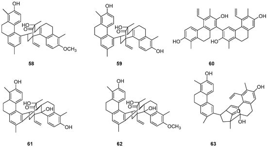 The Dendrobium genus comprises perennial, primarily herbaceous plants with around 240 species distributed globally, predominantly in temperate and cold regions. These plants typically thrive along the water’s edge in grassy swamps and damp environments. In recent years, new structures of dimeric 9,10-dihydrophenanthrenes have been isolated from the Juncus plant. From 1997 to 2002, Dellagreca et al. identified only five types of dimeric phenanthrenes in Juncus acutus [52]. In 2003, six new dimeric 9,10-dihydrophenanthrene compounds (58–63) (Figure 17) were isolated from this species [53]. Diphenanthrenes are rare in this genus, with nine reported from Jasminum acuminatum and one from Wild jasmine [52,54,55]. In the process of bioactive natural products from traditional Chinese medicine, Wei Ma isolated four new phenanthreneoid dimers from the ethanol extract of Juncus effuses’ medulla in 2015, named effususins A–D (64–67) (Figure 18). These compounds’ effects on cell proliferation and survival were measured in SHSY-5Y, SMMC-7721, HepG-2 Hela and MCF-7 cells using the CCK-8 method, with paclitaxel as the positive control. Among the phenanthrene dimers, compound 64 showed moderate to strong cytotoxic activity against all five cancer cell lines, with IC50 values of 32.64, 13.60, 12.93, 25.09 and 12.49 µM, respectively, outperforming paclitaxel except against the SMMC-7721 cell line. The other three compounds exhibited no activity against these cell lines [56]. Csaba Bús et al. extracted a new dimeric phenanthrene, named compressin B (68) (Figure 19), from Juncus compressus Jacq. and tested its antiproliferative activity against three human tumor cell lines: HeLa and SiHa (cervical adenocarcinoma) and A2780 (ovarian cancer). The HeLa cell line was the most sensitive, with an IC50 value of 1.86 μM [57].
