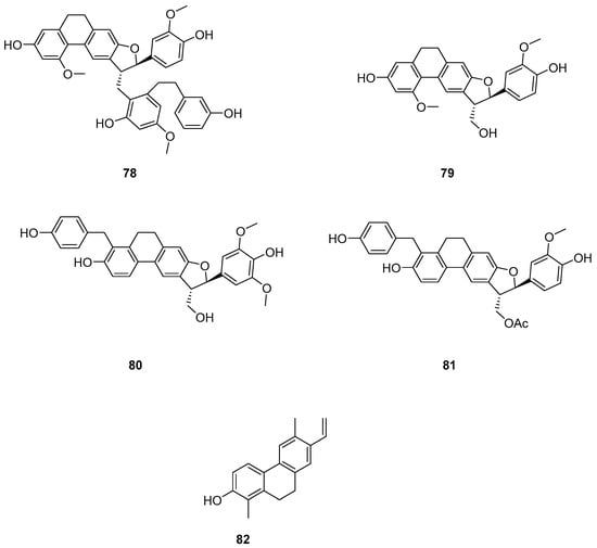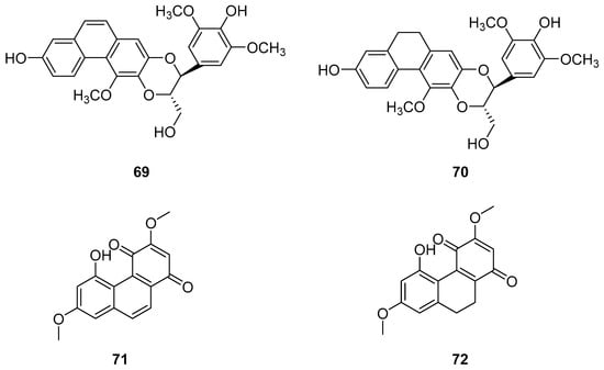 Dendrobium, one of the largest genera in the Dendrobium family, consists of over 1100 species, most of which are found in Asia, Europe and Australia [58]. In China, there are 74 species and two varieties, several of which are utilized in traditional or folk medicine. Phenanthrenes [59] and sesquiterpenes isolated from these plants exhibit significant antioxidant, anti-tumor, immunomodulatory and anti-inflammatory activities [60,61,62,63]. Zhao et al. isolated two new phenanthrenes and 9,10-dihydrophenanthrene derivatives (69–70) (Figure 20), along with six known homologues, from Dendrobium officinale stem extracts. Cell studies conducted on HI-60 and THP-1 cell lines revealed IC50 values of 35.32 ± 1.76, 20.78 ± 1.80, >50 and 45.32 ± 2.39 µM for compounds 69 and 70, respectively [13]. Denbinobin (71) (Figure 20), a phenanthrenequinone from the Dendrobium genus, can be extracted from D. candidum [64,65], D. nobile [18,59,66,67] and D. venustum [68]. Ephemeranthoquinone (72) (Figure 20) is also derived from D. hancockii, D. hongdie [69], D. longicornu [70,71], D. plicatile [72] and other plants. Zhai summarized the IC50 values of these compounds on MCF-7, HL-60, A549 and SW480 cells as 13.13 ± 0.47 and 3.63 ± 0.03, 3.08 ± 0.12 and 2.33 ± 0.12, 19.68 ± 1.12 and 14.79 ± 0.64 and 16.81 ± 0.13 and 6.66 ± 0.71 μM, respectively [73].