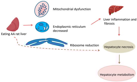 AA is a key component in Chinese herbal medicines such as AA and asarum, commonly found in Southern Brazil and India. These herbs are used to treat various ailments including eczema, pneumonia, stroke, hepatitis, snakebite, arthritis, gout and coronary artery disease. Research published on 18 October 2017, by scientists from Singapore and Taiwan indicated that AA was responsible for a majority of hepatocellular carcinoma (HCC) cases in Taiwan [91]. In 2019, Ouyang monitored the metabolism of AAI and its residues in the liver and kidneys of rats fed with AAI, discovering that AAI metabolized in the kidney while AAT residues were found in both the liver and kidney [92]. In 2021, Wang et al. conducted toxicity tests on rats with varying doses of AA, finding that increased doses resulted in liver mitochondrial damage, reduction in organelles such as ER and ribosomes, liver inflammatory cell infiltration and a tendency toward fibrosis. These findings indicate that AA can cause hepatocyte necrosis and subsequently impair hepatocyte metabolic function. The prolonged and high-dose usage of AA leads to severe liver damage in a dose-dependent manner [93]. This aligns with Quan et al.’s 2020 findings that AA-containing herbs damaged mouse kidney mitochondria [94]. AA induces liver injury through oxidative stress and mitochondrial apoptosis pathways. The results showed that AST and ALT levels in serum were significantly elevated in all dose groups compared to the control, confirming dose-dependent toxicity [95]. In Wang’s study, the highest serum AST and ALT levels were observed in the 20 mg/kg-AA dose group, confirming the severe hepatic damage at this concentration [93]. Oxidative stress, primarily occurring in mitochondria, is a major pathological factor in many organisms and can lead to apoptosis [96]. The mitochondrial-mediated apoptosis pathway is one of the classic routes of apoptosis [97], which are critical factors in AA-induced hepatotoxicity (Figure 24).