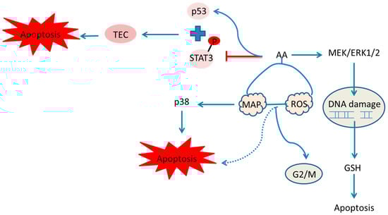 ROS or reactive nitrogen species (ROS/RNS) are products of normal cell metabolism, playing a crucial role in cell signal transduction and homeostasis. The excessive ROS/RNS production or depletion of endogenous antioxidant systems can lead to oxidative/nitrosative stress [112]. Exogenous substances like AA can also induce oxidative stress, resulting in cellular damage [113]. AA has been shown to damage DNA by stimulating ROS production. Yu used human cells to further explore the mechanism of AAI-induced DNA oxidative damage [114]. Romanov et al. noted that AA could induce apoptosis and cell arrest in the G2/M phase by generating ROS and activating the mitogen-activated protein kinase (MAP kinase), which in turn activates p38, leading to apoptosis (Figure 26) [48].