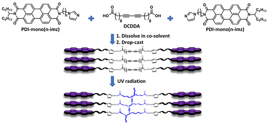 Schematic illustration of the supramolecular formation of DCDDA and PDI-mono(n-imz) to form 2:1 PDI-mono(n-imz)/DCDDA and their subsequent polymerization to the blue phase by 254 nm UV radiation.