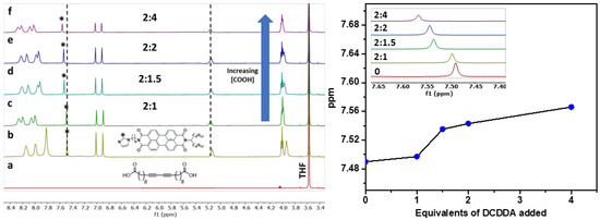The supramolecular PDI-mono(6-imz)/DCDDA structures formed in solution were analyzed by 1H NMR spectroscopy in tetrahydrofuran-d8 (THF-d8) at room temperature at increasing concentrations of DCDDA (Figure 2). The aromatic proton in the imidazole ring (labeled with *) successively shifts downfield from 7.49 ppm to 7.57 ppm upon increasing equivalents of DCDDA. This is a result of the hydrogen bonding between the carboxylic acid groups of DCDDA and the imidazole head groups of PDI-mono(6-imz). Additionally, the proton shifts associated with the PDI aromatic core broaden, indicating supramolecular formation, in agreement with the previous literature [58]. The titration profile obtained with increasing amounts of DCDDA added shows a critical transition when approximately 2 equiv of PDI-mono(6-imz) is used for 1.25 equiv of the diacid, which deviates from the expected 2:1 supramolecular structure. This deviation may be a result of the limited solubility of PDI-mono(6-imz) in THF-d8 in comparison to DCDDA at 2 wt%. This will lead to a lower concentration of PDI-mono(6-imz):DCDDA in solution, which may be the reason for the greater-than-expected experimental equivalence point. This may result in the drop-cast films not adopting the expected 2:1 supramolecular structure, as not all of the DCDDA carboxylic acid units complex with the PDI-mono(n-imz) molecules. This phenomenon is consistently observed for shorter methylene spacer lengths of n = 3 and 4 (Figures S1 and S2, respectively) as well.