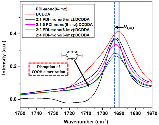 Upon drop-cast film formation, the supramolecular structures of PDI-mono(6-imz):DCDDA were shown to maintain imidazole–acid complexation in the solid state according to Fourier transform infrared (FTIR) spectroscopy analysis (Figure 3). Similar acid-appended DA monomers organize in the solid state by carboxylic acid dimerization [59]; therefore, the addition of a molecule with a basic binding site, such as imidazole, should disrupt the dimerization phenomenon [60,61]. This is seen when comparing the absorbance from 1725 cm−1 to 1700 cm−1, which represents carboxylic acid dimerization stretching, of pure DCDDA (red line) and 2:1 PDI-mono(6-imz):DCDDA (blue line), where there is clearly a large decrease in the signal intensity. Furthermore, there is a gradual increase in the intensity of this band as the concentration of DCDDA is increased. Additionally, the solid blue vertical line shifting at 1690 cm−1 to 1693 cm−1 (dashed blue vertical line) represents the change in C=O stretching when carboxylic acid dimerization is disturbed. This phenomenon is also consistent with complexes composed of shorter methylene spacer lengths of n = 3 and 4 (Figures S3 and S4, respectively).