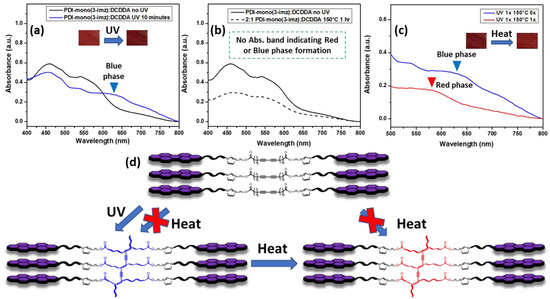 UV–Vis spectra of 2:1 PDI-mono(3-imz)/DCDDA drop-cast films indicating (a) blue-phase PDA formation after UV irradiation, (b) no PDA formation after thermal treatment at 150 °C for 1 h, (c) blue-to-red-phase PDA transformation upon after thermal treatment at 150 °C for 1 h, and (d) stimuli-specific chromatic transition diagram of 2:1 PDI-mono(3-imz)/DCDDA supramolecular system. The insets in (a,d) show photographs of 2:1 PDI-mono(3-imz)/DCDDA drop-cast films before/after UV and after UV/after UV and heating, respectively.