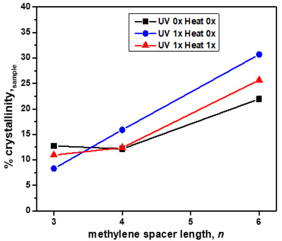 The % crystallinity of samples of 2:1 PDI-mono(n-imz)/DCDDA drop-cast films calculated from WAXS (% crystallinity,sample) as a function of the methylene spacer length, n (where n = 3, 4, or 6), where black squares, blue circles, and red triangles represent the stimuli treatment provided to the drop-cast films (UV mx Heat mx).