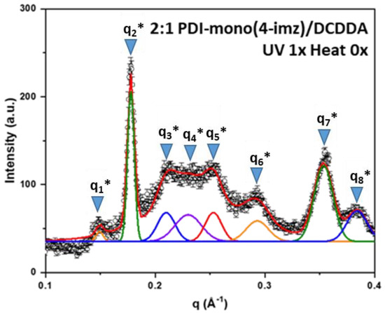 SAXS peaks (Figure 6), qn*, and the corresponding d-spacing of the 2:1 PDI-mono(4-imz)/PDCDDA drop-cast films.